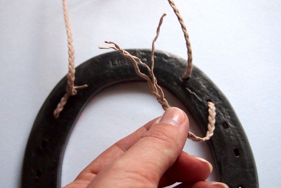 2. Provlékněte kůži horními otvory podkovy a rozpleťte poslední 3 cm provázku.